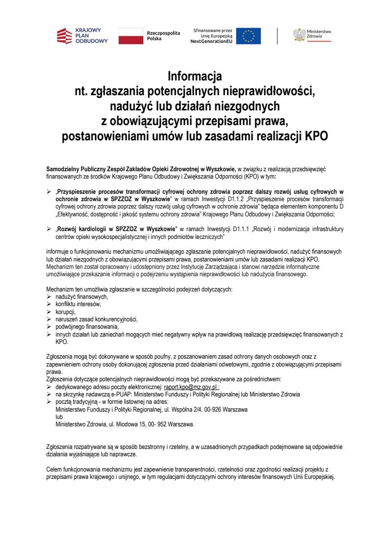 Realizacja projektu w SPZZOZ w Wyszkowie wpisuje się w te założenia, przyczyniając się do budowy nowoczesnego, bardziej odpornego i interoperacyjnego systemu opieki zdrowotnej na poziomie lokalnym i krajowym. Projekt zakłada pełną zgodność z wymaganiami w zakresie interoperacyjności, co umożliwi jego integrację z ogólnopolską infrastrukturą e‑zdrowia, w tym z Repozytorium Informacji o Zdarzeniach Medycznych prowadzonym przez Centrum e‑Zdrowia.